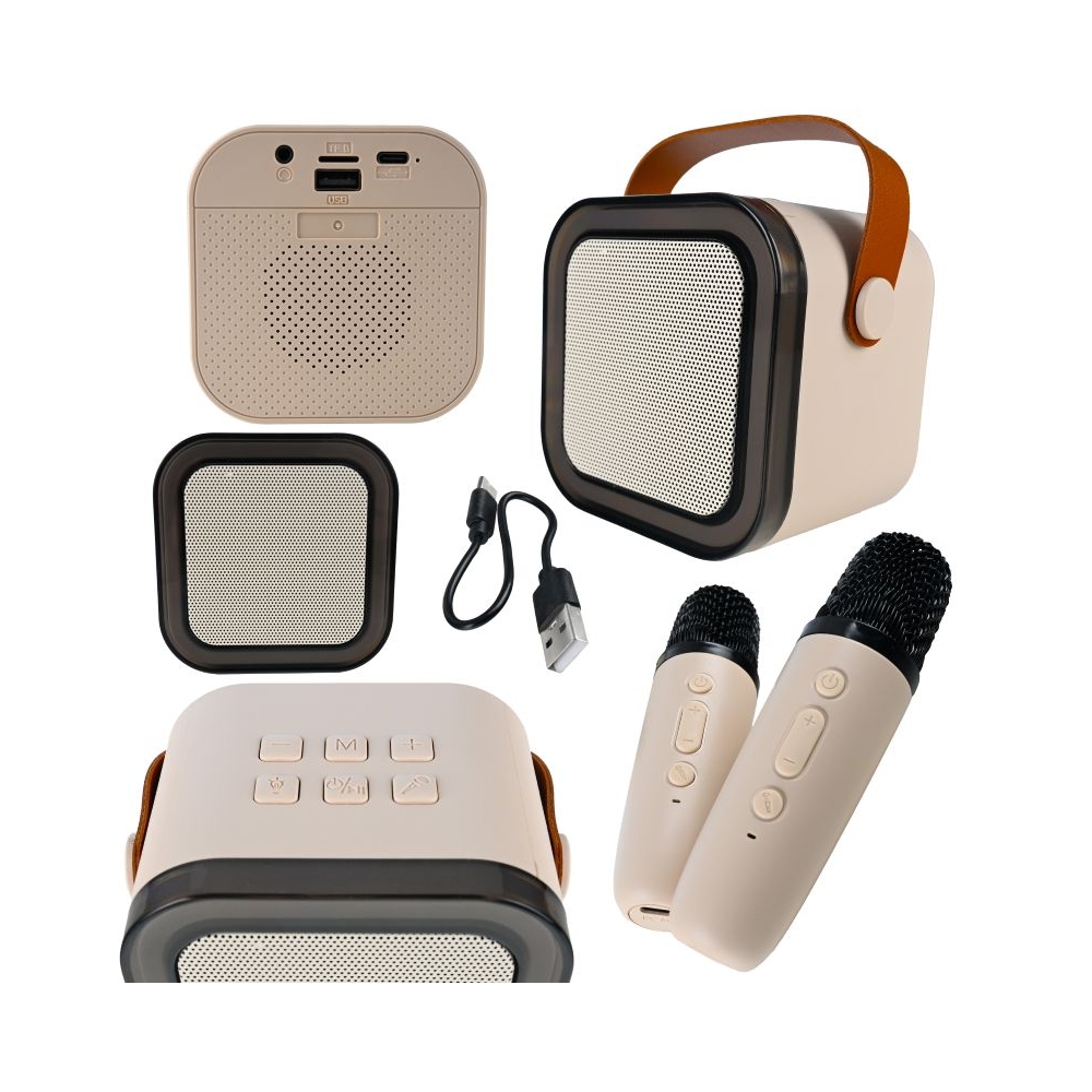 Kompaktiškas, bet galingas 6 W garsiakalbis užtikrina aiškų ir sodrų garsą, o du belaidžiai mikrofonai leidžia dainuoti solo arba duetu – smagumas garantuotas visai šeimai!